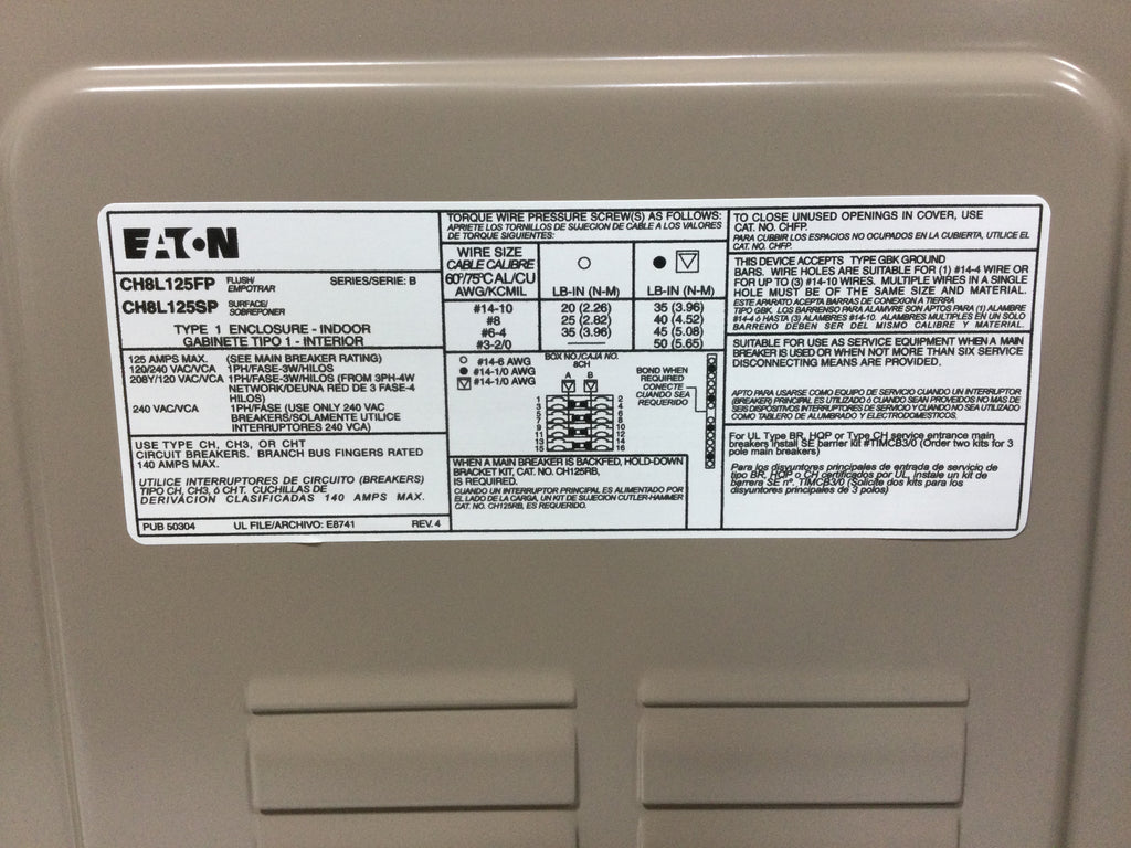 Eaton/Cutler-Hammer CH8L125SP Type 1 Enclosure 125A 120/240VAC Type CH,CHT Load Center
