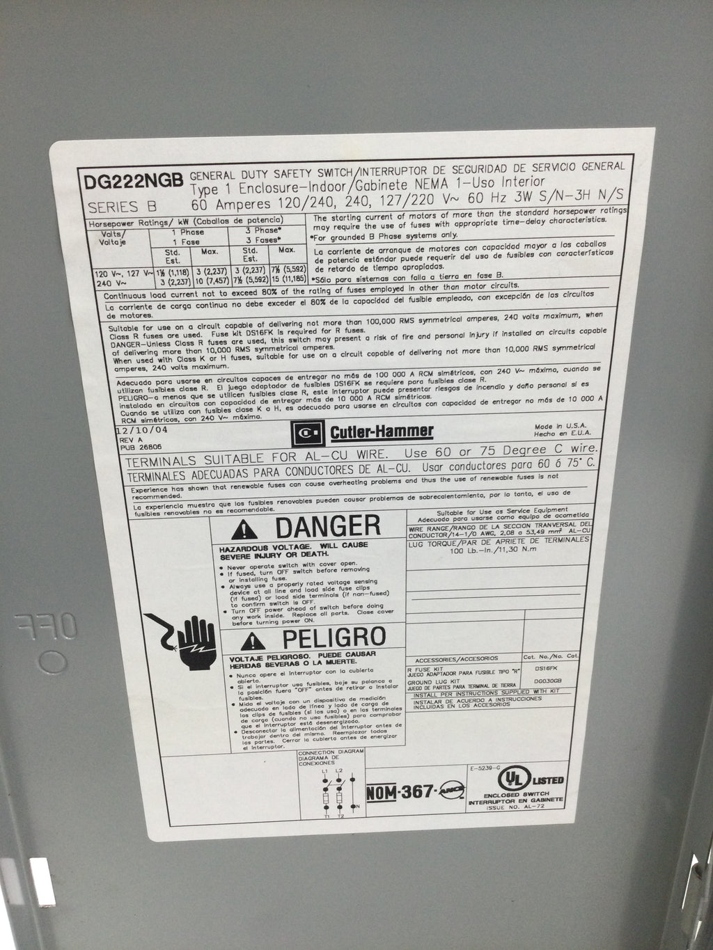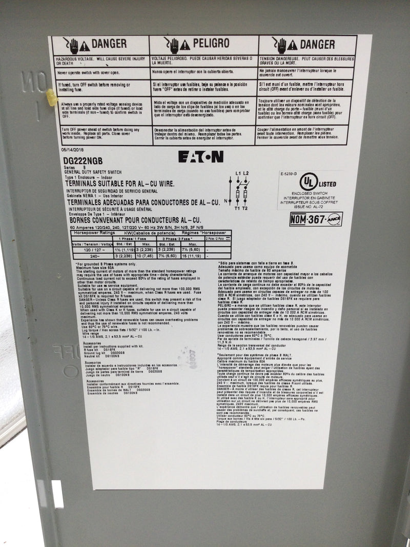 Eaton/Cutler Hammer DG222NGB 60A 2 Pole 240V Fusible Safety Switch 14 1/4" x 9"