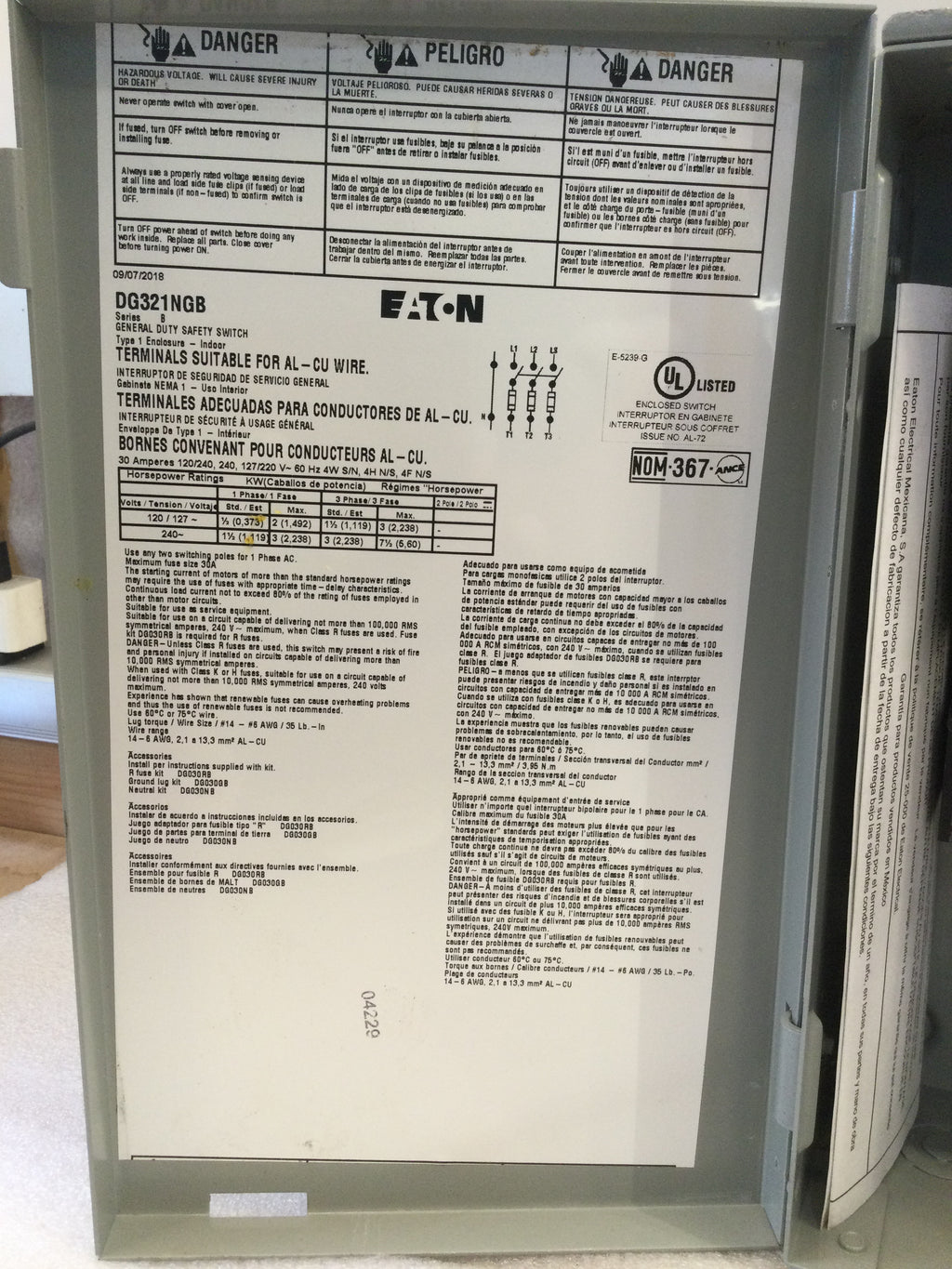 Eaton/Cutler-Hammer DG321NGB 3 Pole 30 Amp 120/240V Type 1 Fusible Safety Switch