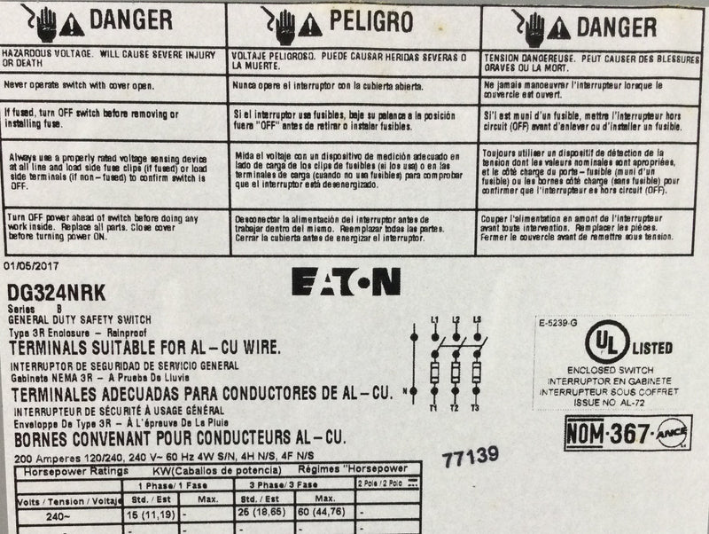 The Eaton/Cutler-Hammer DG324NRK is a heavy-duty fused safety switch rated for 200 amps at 240 volts, designed for three-pole applications. This industrial-grade disconnect switch provides reliable load isolation and circuit protection in commercial and industrial settings.