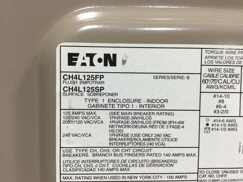 Eaton Cutler Hammer Series CH4L125SP 125 Amp 4 Space 8 Circuit Indoor Mail Lug Load Center