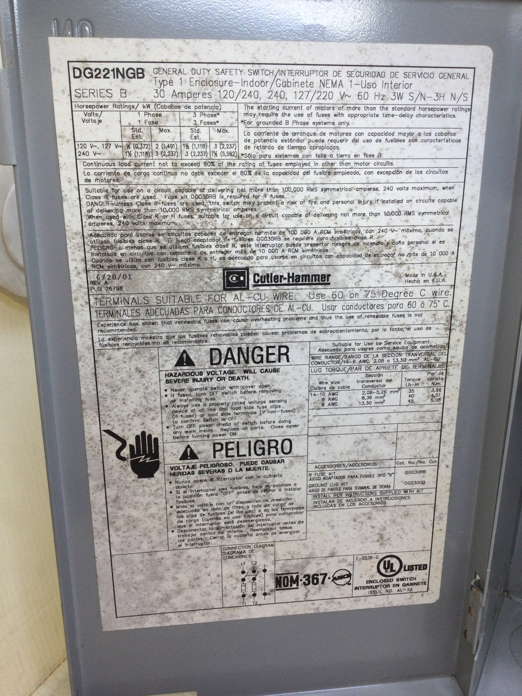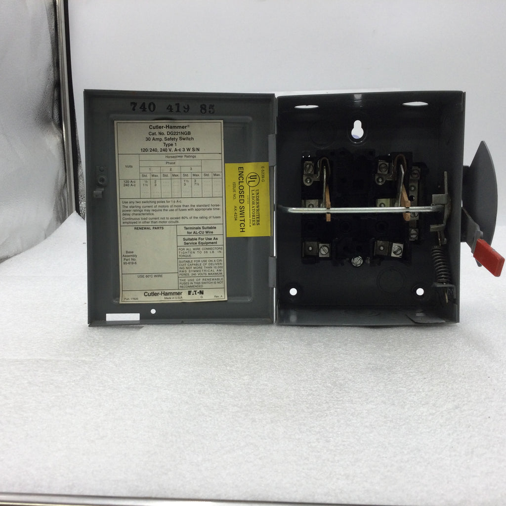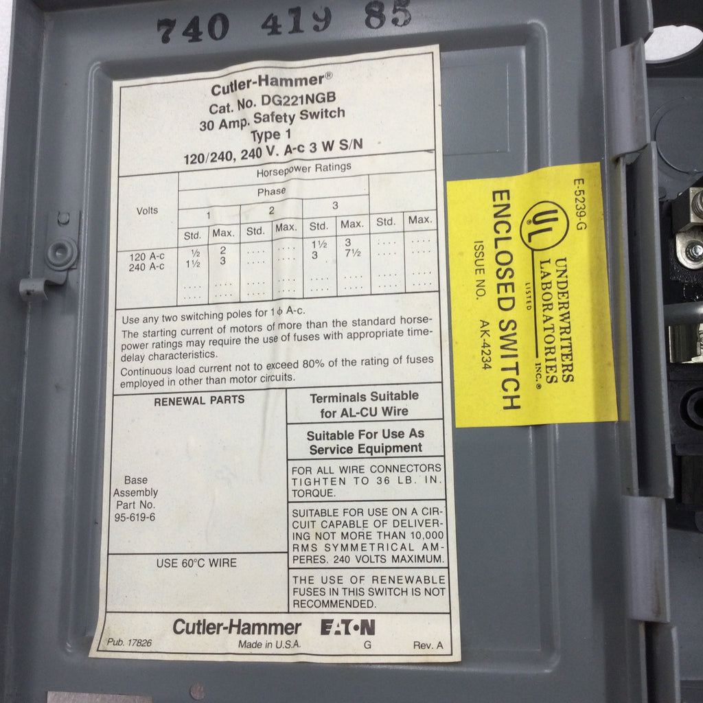 This Eaton/Cutler Hammer DG221NGB Fusible Safety Switch is designed for general duty use, with a 30 amp rating and 240 VAC capacity. Its 2 pole design ensures reliable and safe operation. Perfect for a wide range of applications and industries, this safety switch offers a secure and efficient solution for your electrical needs.