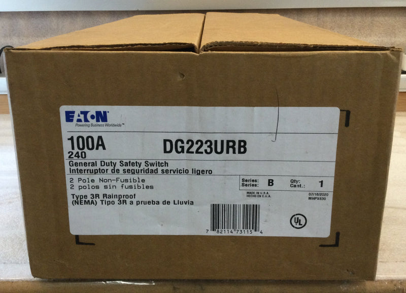 The Eaton DG223URB is a 100 Amp, 2-pole, 240V general duty non-fused safety switch designed for reliable power isolation and safety in electrical systems. Its sturdy construction ensures durable performance, making it ideal for commercial and industrial applications requiring secure, non-fused disconnecting means.