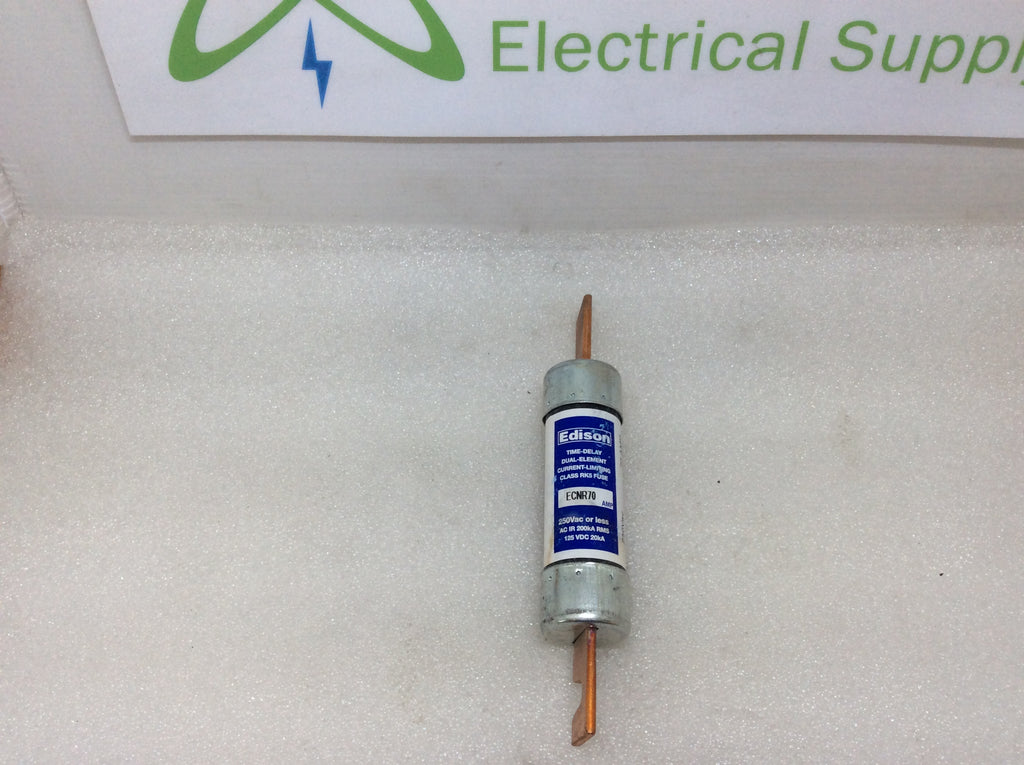 The Edison ECNR70 70 Amp 250V Time Delay Dual Element Class RK5 Fuse is a high-quality fuse designed for industrial and commercial applications. With its time delay feature and dual elements, it offers superior protection against overloads and short circuits. Trust in its reliable performance for your electrical systems.