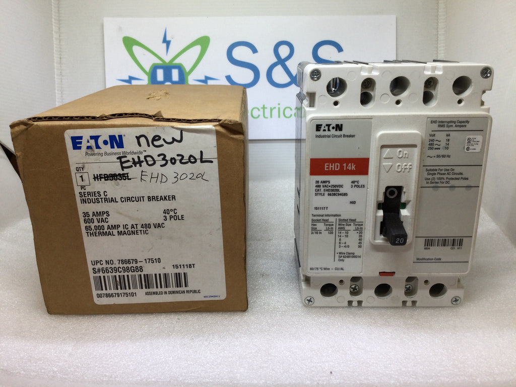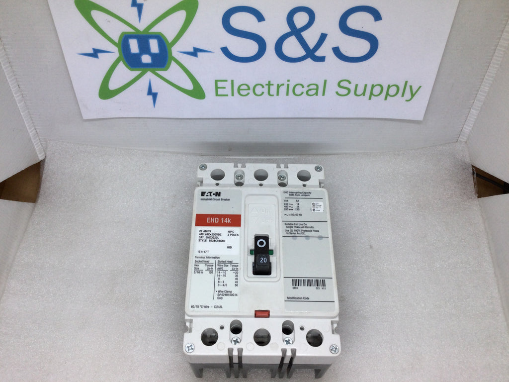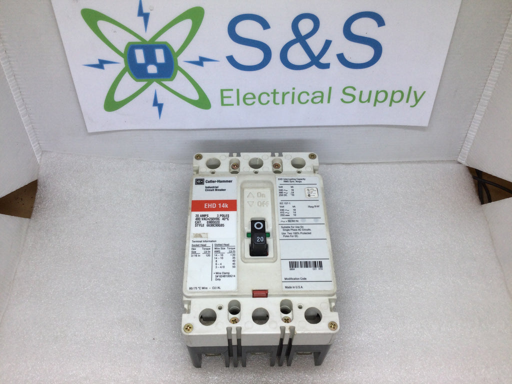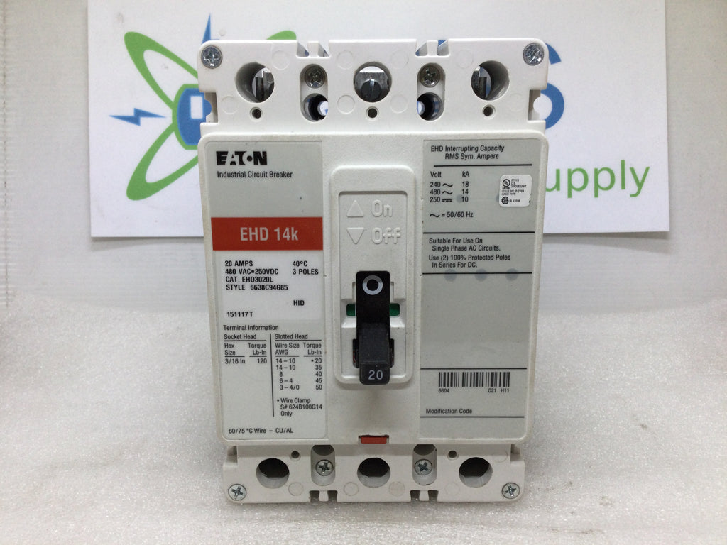 Eaton/Cutler Hammer EHD3020L/EHD3020 3 Pole 20 Amp 480V Circuit Breaker Type EHD14k