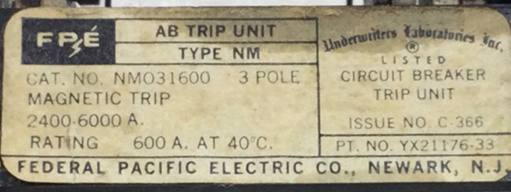 Federal Pacific NMO31600 600 Amp 3 Pole Circuit Breaker Amp Trip Unit