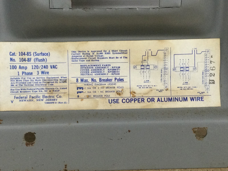 FPE 104-8S/F 100 Amp 4-8 Space 120/240V Load Center Cover Only 12 5/8" x 8 3/4"