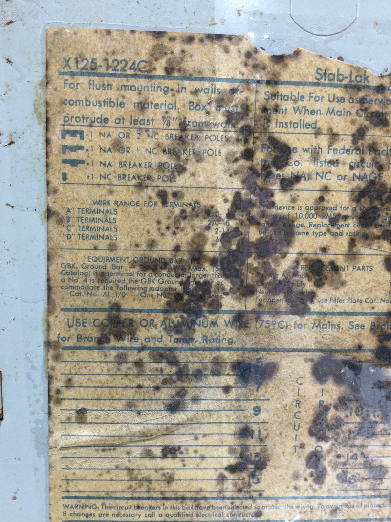 Federal Pacific X125-1224C 125A 20 Space 120/240V Panel Door 20 5/8" x 15 3/8"
