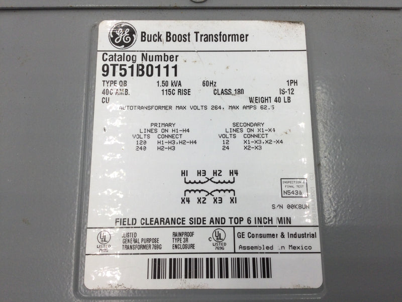 GE General Electric 9T51B0111 Transformer Type QB 1.50KVA 1PH 60Hz 40C AMB 115C Rise Class 180