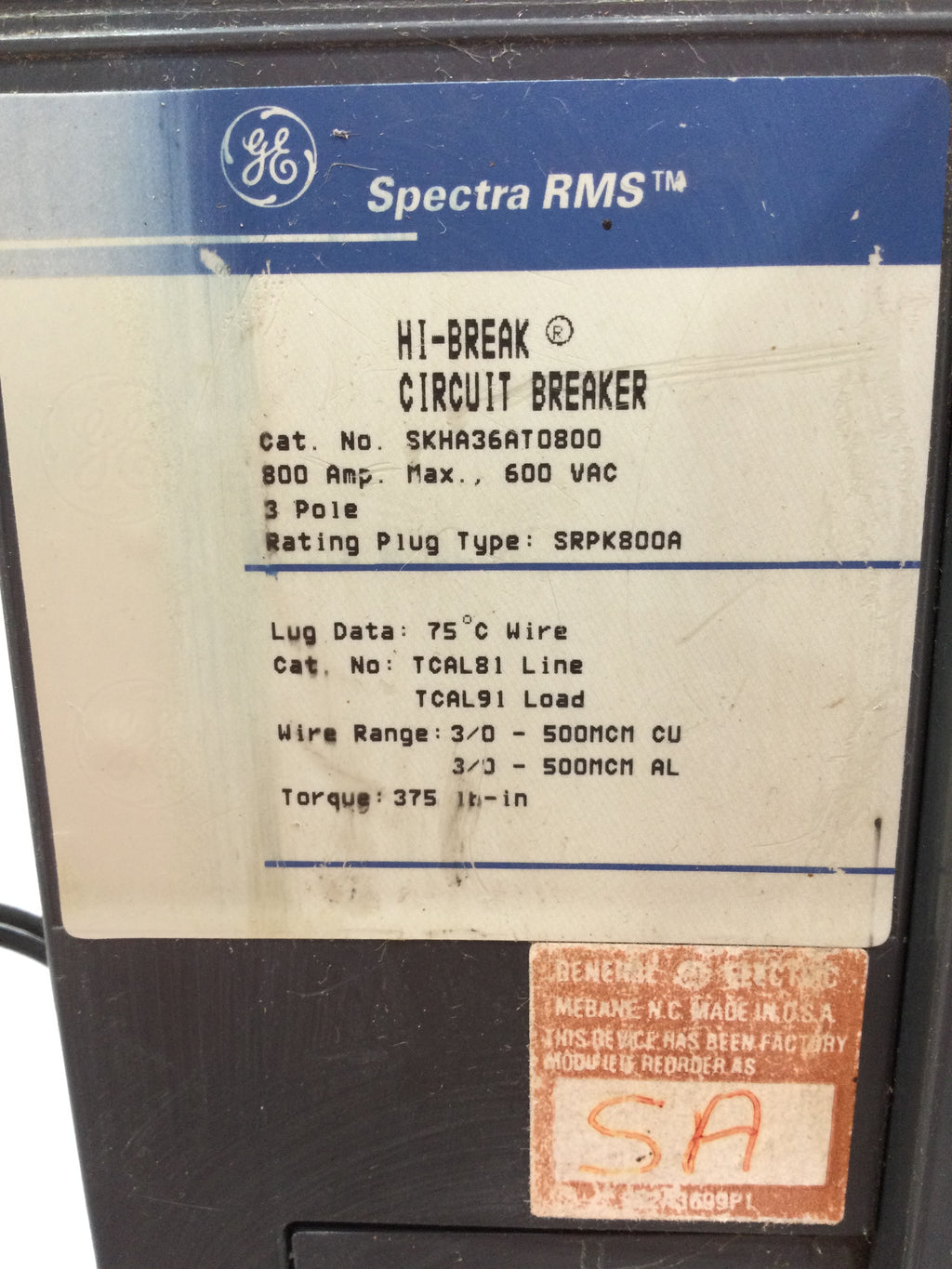 GE General Electric SKHA36AT0800 800 Amp Frame w/Shunt Trip SAST1 Spectra RMS Circuit Breaker