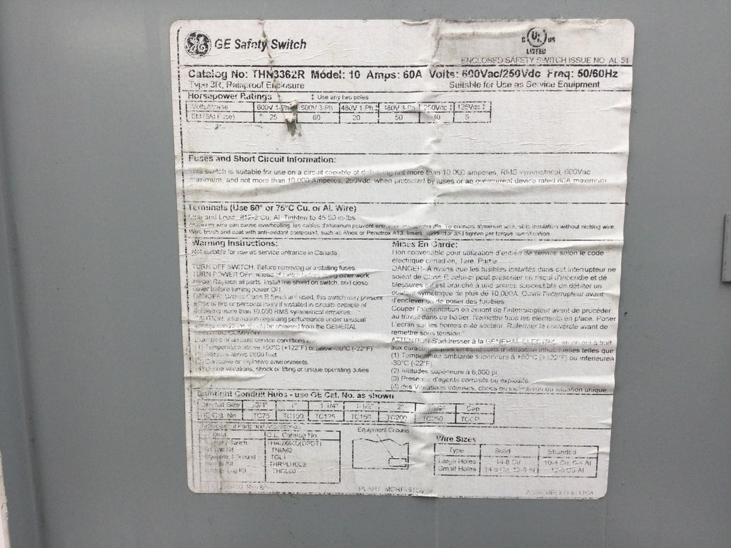 GE General Electric THN3362R 60 Amp 600V/250VDC 3 Pole Non Fused Nema 3R Safety Switch 17.5" x 9"