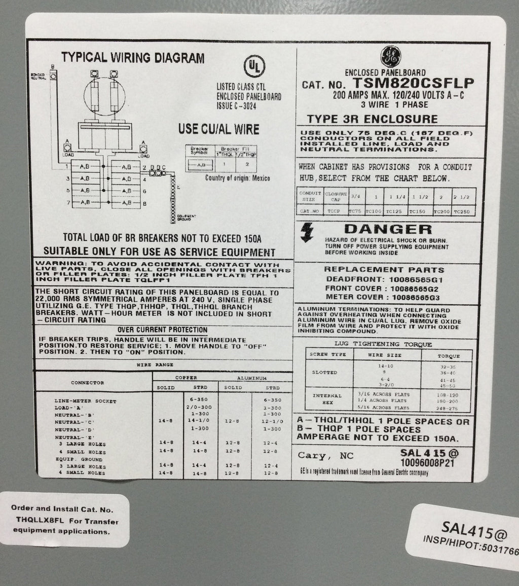 GE TSM820CSFLP 200 Amp 8 Space 240V Main Breaker Meter Socket/Load Center