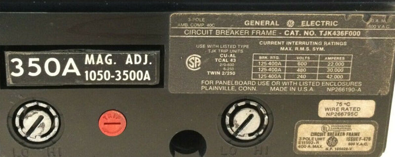 General Electric TJK436F000 400 Amp 3 Pole 600V Circuit Breaker w/350 Amp Trip