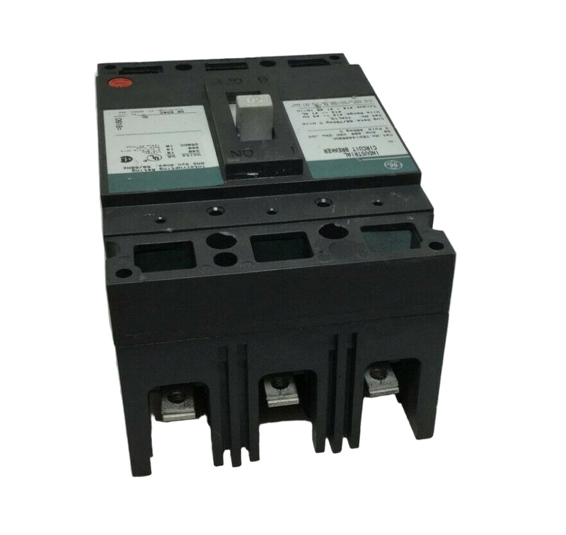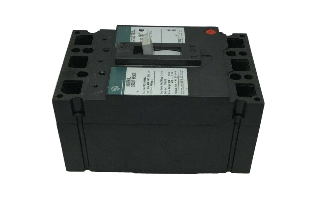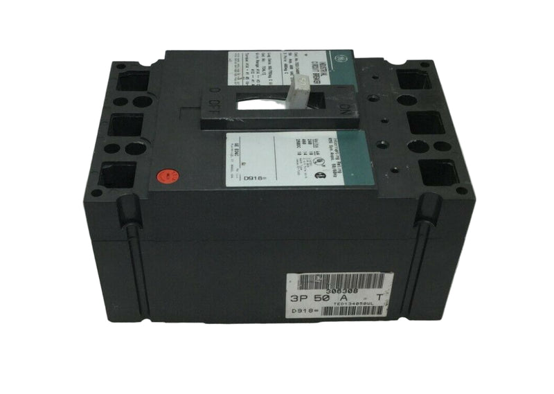 General Electric TED134050WL 50 Amp 3 Pole 480V Circuit Breaker with green label identification. This industrial-grade breaker delivers reliable overcurrent protection for three-phase 480V systems. Engineered for demanding commercial and industrial applications, it features a 50 amp rating and meets rigorous safety standards. The distinctive green label ensures quick identification in crowded electrical panels.