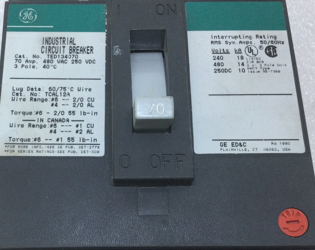General Electric TED134070 70 Amp 3 Pole 480V Molded Case Circuit Breaker