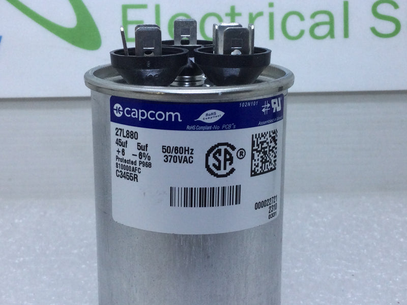 Introducing the Genteq/Capcom Capacitor 27L880 45/5uf+/-6% 50/60Hz 370V GE Round C 97F9895BZ3. This top-of-the-line capacitor offers precise 45/5uf+/-6% capacity, providing optimal performance for your electrical system. With a 370V capacity and a durable round C design, this capacitor is perfect for residential and commercial use. Improve your system's efficiency with Genteq/Capcom.