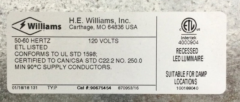 H.E.Williams Recessed LED Luminaire L45TL-llC/830-L/REFL-DRV-120
