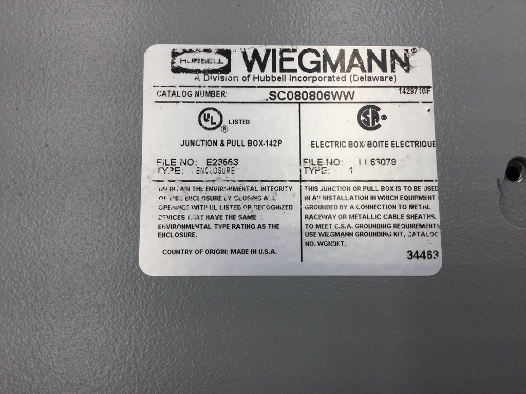Hubbell-Wiegmann SC080806WW 8" x 8" x 6" Nema 1 Screw Cover Type Pull/Junction Box (New)