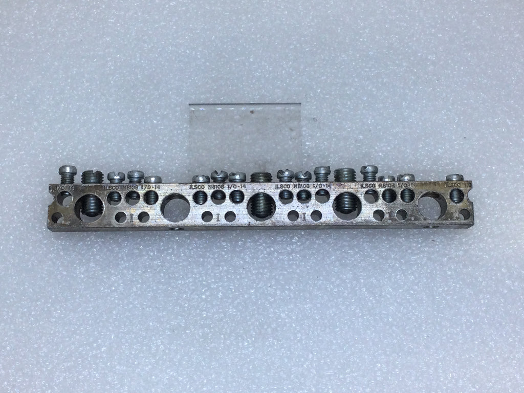 Ilsco N8108 grounding bar with 29 positions accommodates wire gauges from 1/0 to 14 AWG. Designed for reliable electrical grounding applications in residential and commercial installations.