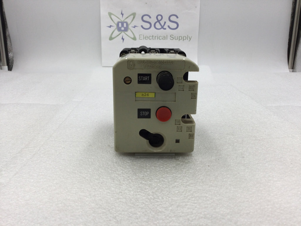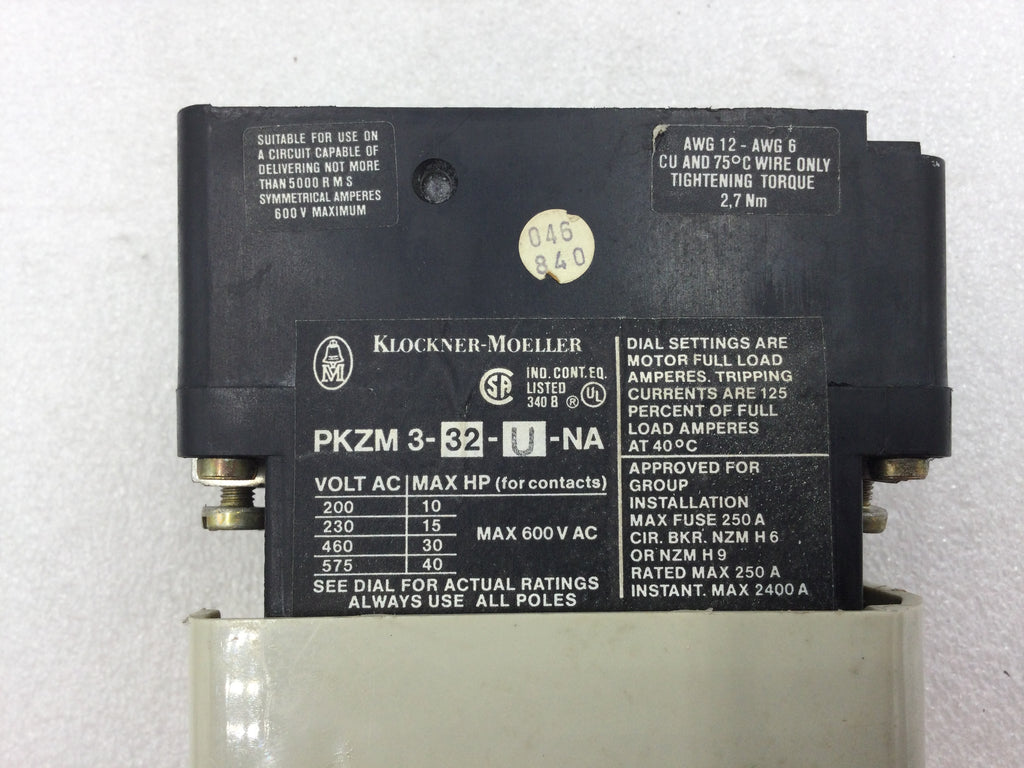 Klockner-Moeller PKZM 3-32-U-NA 3 Manual Motor Starter 32 Amp 200-575 VAC 2-7.5 HP with Start and Stop Buttons
