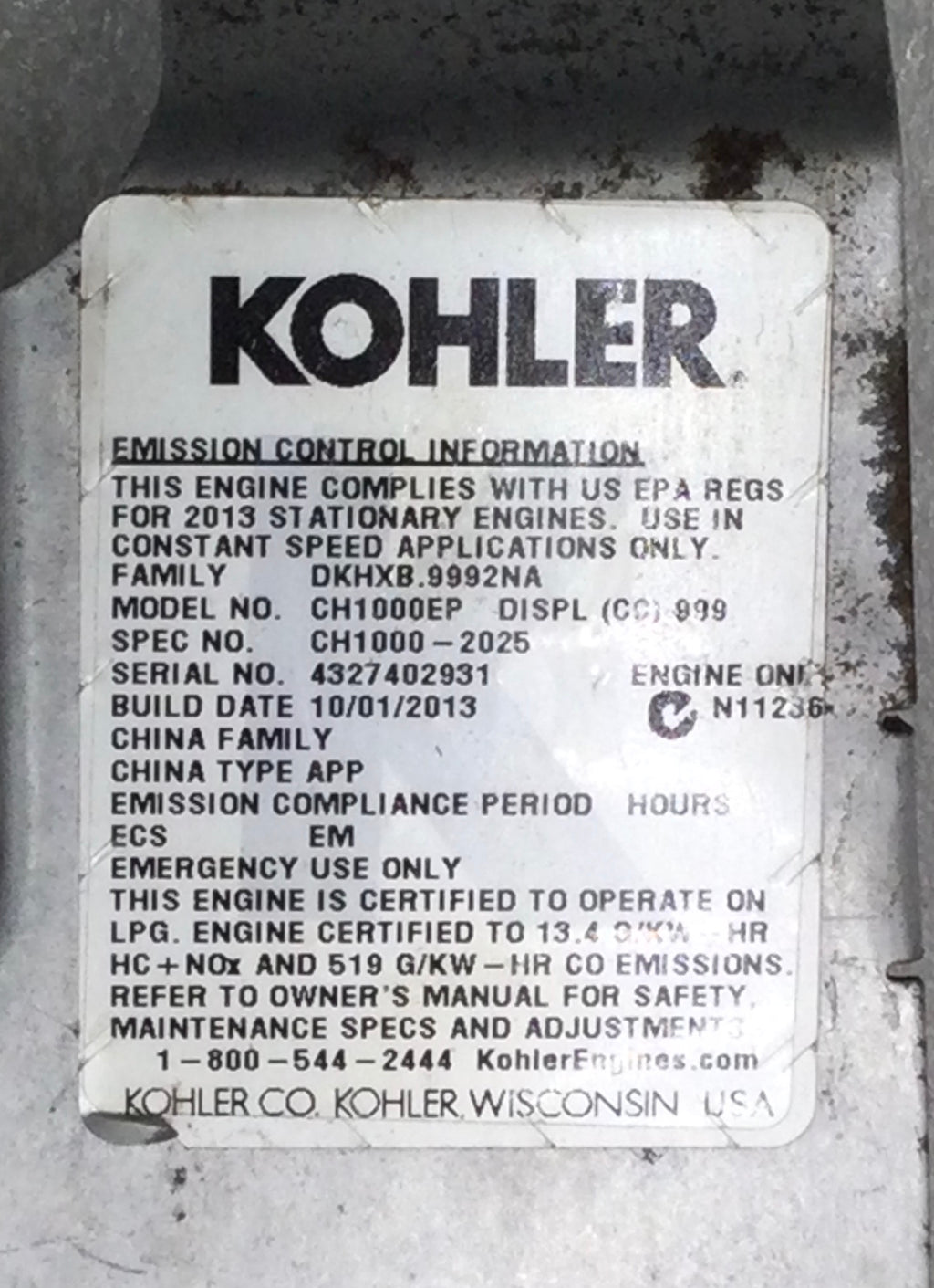 • Type: Kohler Power Systems Class H Enclosure Generator/ Right Side Shroud Valve Cover / Bolt-On