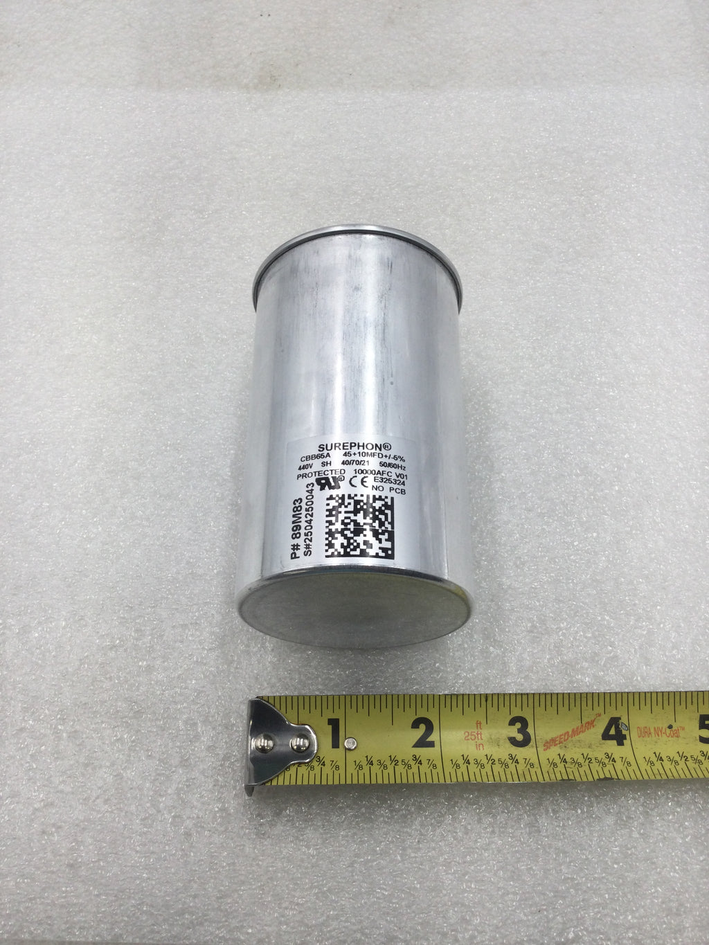 The Surephon 89M83 is a reliable round run capacitor rated at 45+10 MFD and 440 VAC with a tolerance of +/- 5%. Designed for efficient motor operation, it ensures stable performance and energy savings in HVAC and electrical systems. Its durable construction provides long-lasting service in demanding environments.