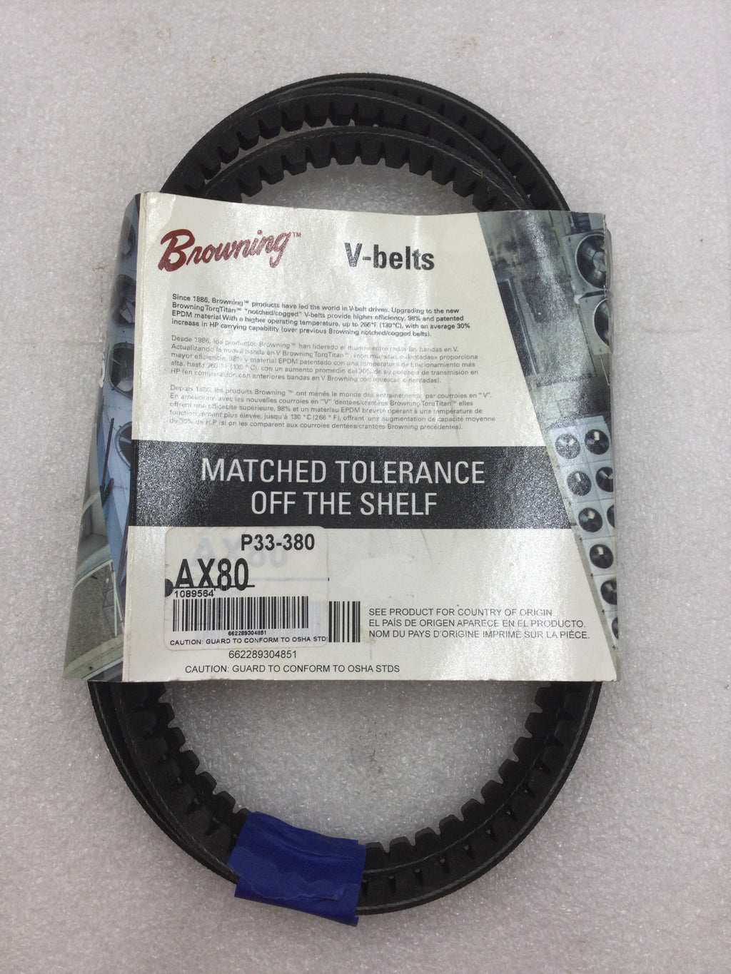 The Browning AX80 TorqTitan V-Belts provides superior power transmission with its notched/cogged design and 83" overall circumference. With increased durability and efficiency, these belts are perfect for heavy-duty industrial applications. Upgrade your machinery with these reliable V-Belts.