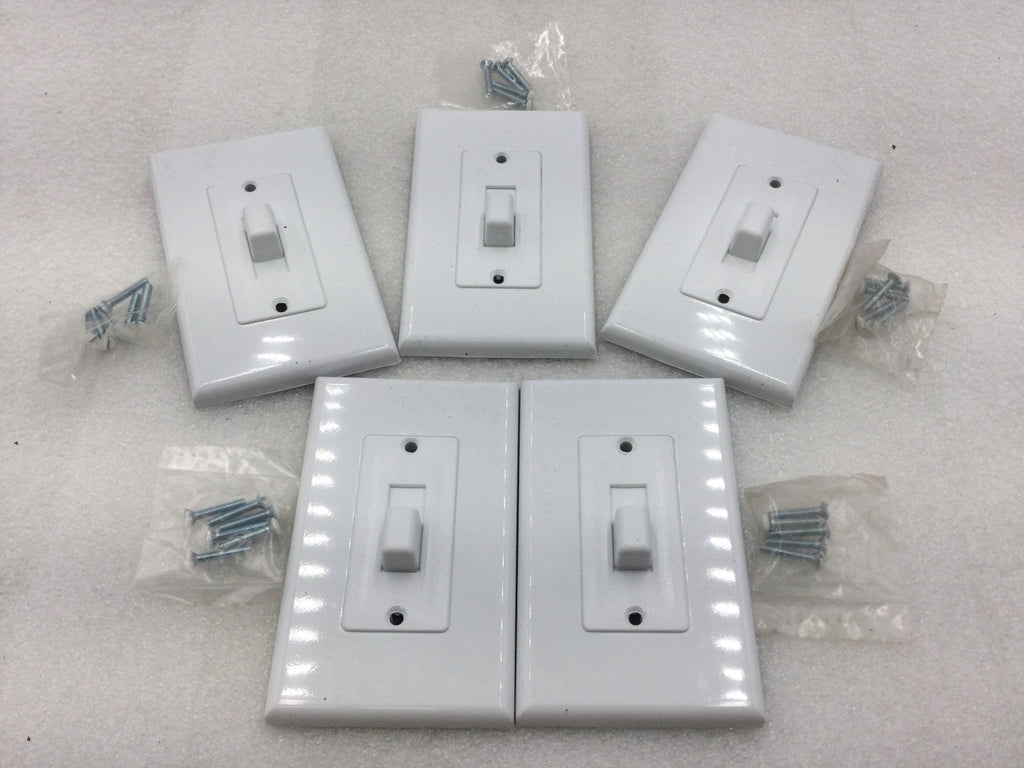 This lot of 5 Hubbell Taymac MW2570W White Decora Style Toggle Switch Cover-Up Wall Plates provide a sleek and modern solution for concealing unused switches. With a durable design and easy installation, these plates are perfect for any home or office setting. Upgrade your wall plates today with this convenient and stylish set.