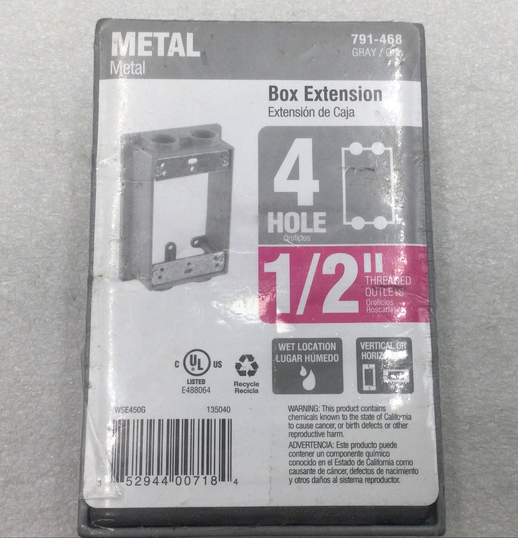The Metal 791-468 4 Hole 1 Gang 1/2" Threaded Weatherproof Box Extension provides a reliable solution for extending electrical box depth. Designed with four mounting holes and a durable threaded metal construction, it ensures secure and stable installation while accommodating additional wiring space.