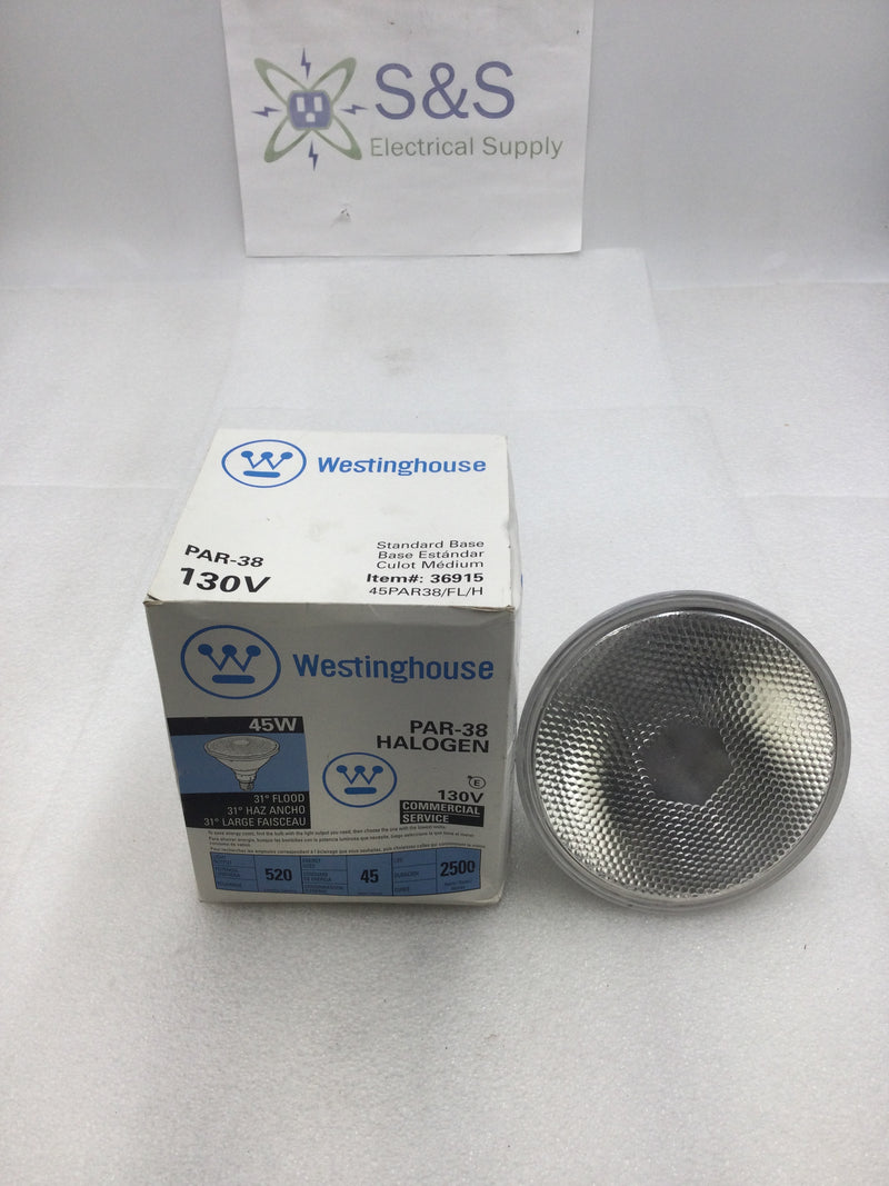 Introducing the Westinghouse 45PAR38/FL/H Halogen Bulb, perfect for indoor and outdoor flood or spot lighting. With 45 watts and 120/130 volts, this lamp offers bright and efficient lighting for any environment. Trust in Westinghouse for superior quality and durability.