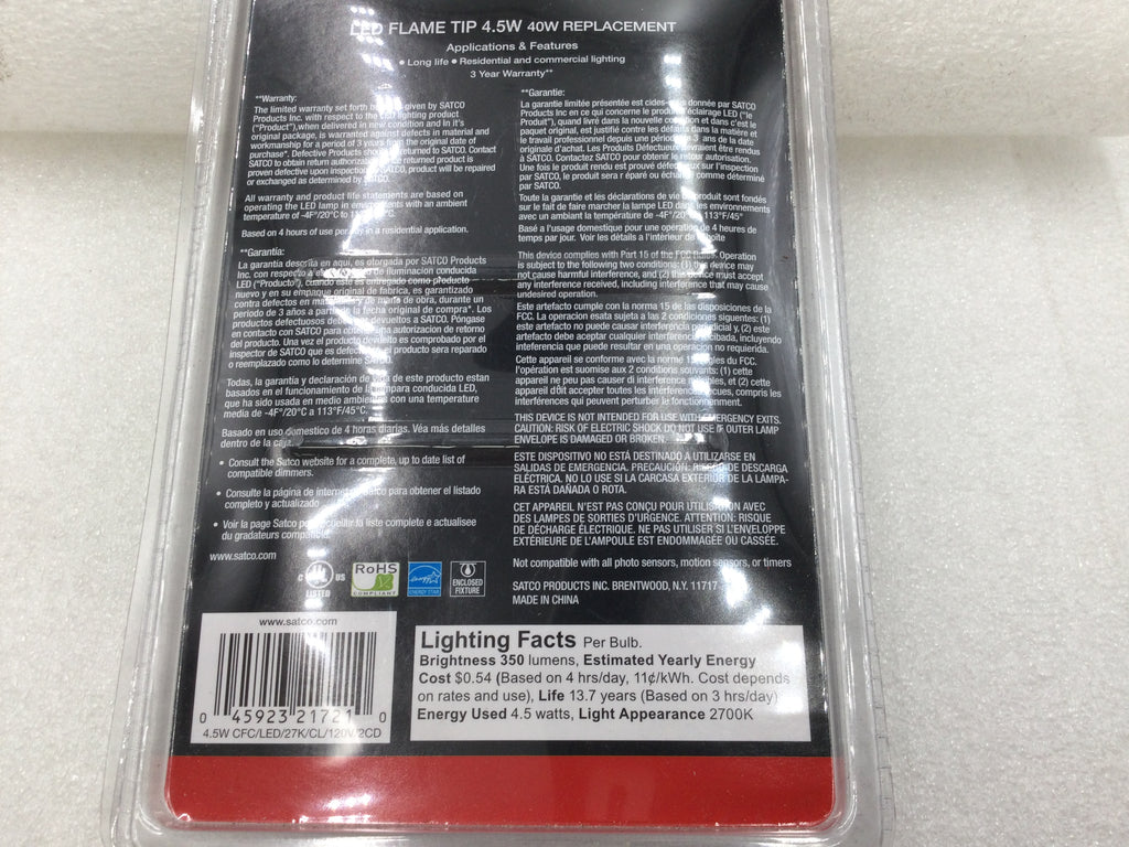 The Satco S21721 is a pack of 2 dimmable LED lamps. With 4.5 watts of power and 120 VAC, these lamps have a decorative flame tip design. They provide energy-efficient lighting and are ideal for creating an inviting ambiance in any room.