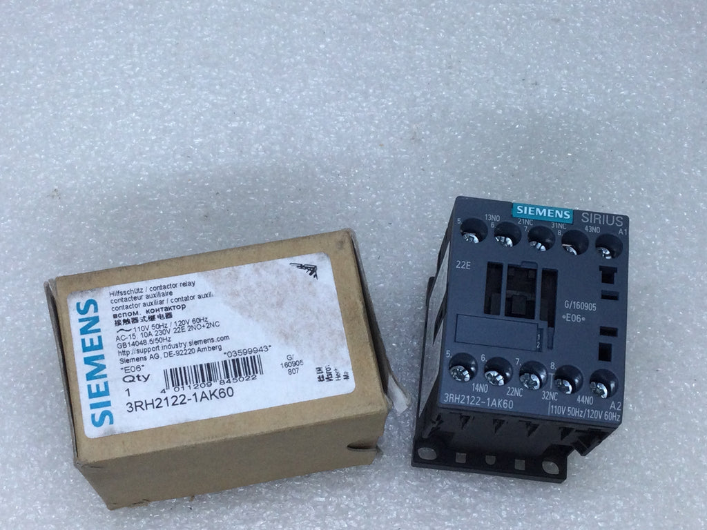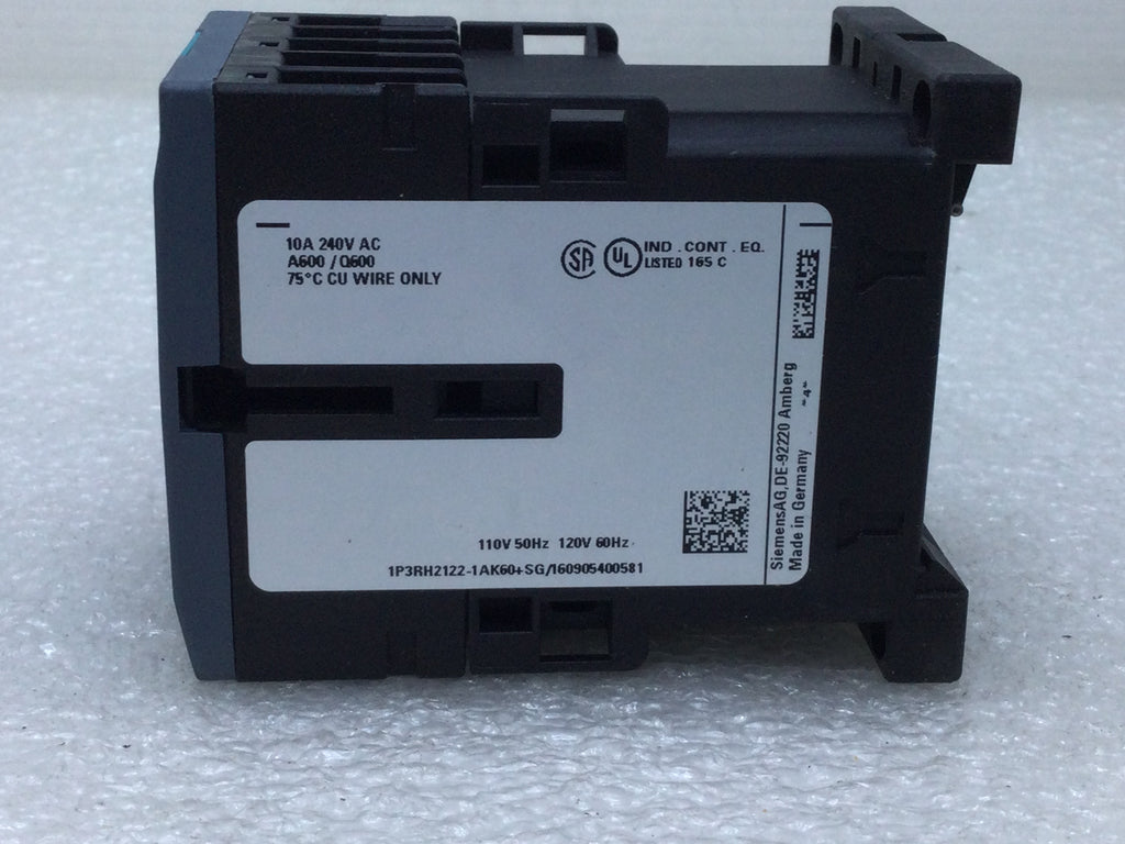 The Siemens 3RH2122-1AK60 contactor relay features a 110/120V coil compatible with 50/60Hz power supply, designed for three-phase systems up to 600V. It supports motor loads up to 10HP, providing reliable high-performance switching and protection. Ideal for industrial applications, this contactor ensures efficient control and durability in demanding electrical environments.