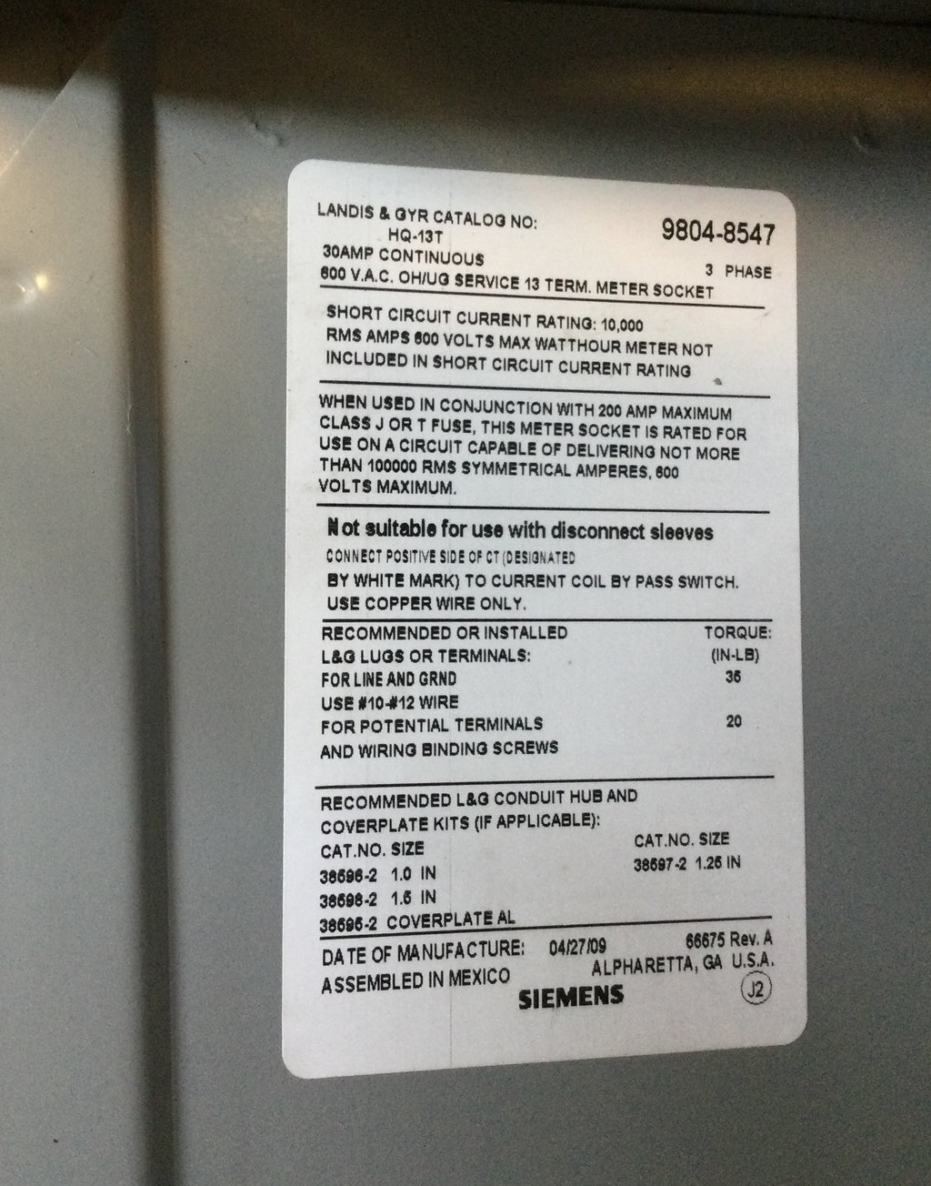 Siemens 9804-8547 30A, 3ph, 600VAC, OH/UG Service, HQ-13 Term. Meter Socket, NEMA3R Enclosure