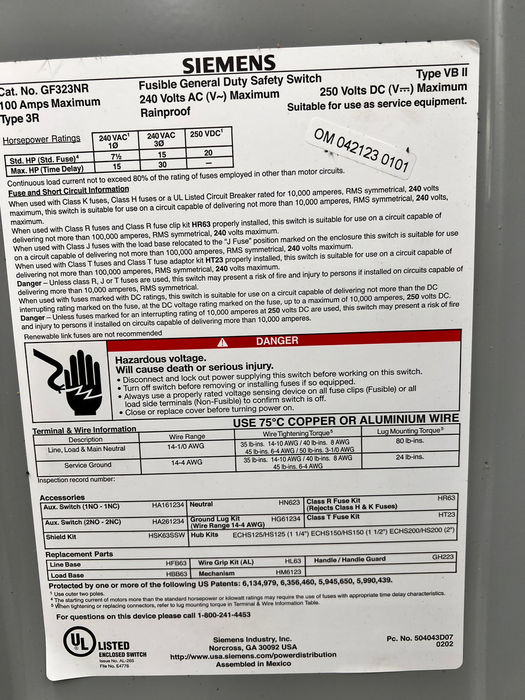 Siemens Fusible General Duty Safety Switch GF323NR 100 Amp Type 3R 240v