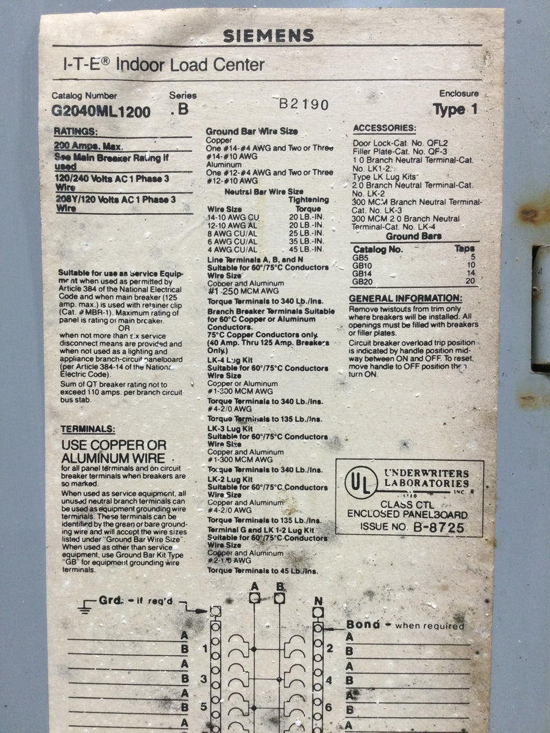 Siemens/ITE G2040ML1200 20 Space 40 Circuit 200 Amp 120/240V Cover/Door and Dead Front Only 28 1/4" x 15 1/2"