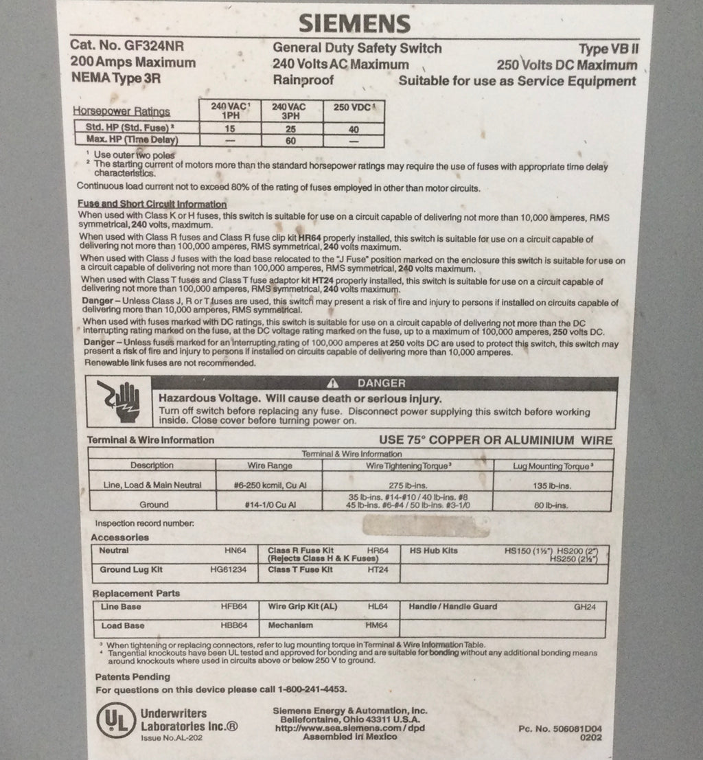 The Siemens GF324NR is a 200 Amp, 3-pole fusible safety switch designed for 120/240V applications. Engineered for reliable circuit protection, it provides secure disconnection and overload protection through its fusible design. Ideal for industrial and commercial electrical systems, this switch ensures safe maintenance and operational integrity by isolating power when necessary. Its robust construction supports long-term durability in demanding environments.