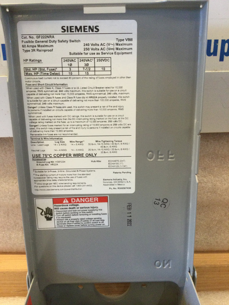 Siemens GF222NRA Single Phase 60A 240VAC Fusible General Duty Safety Switch