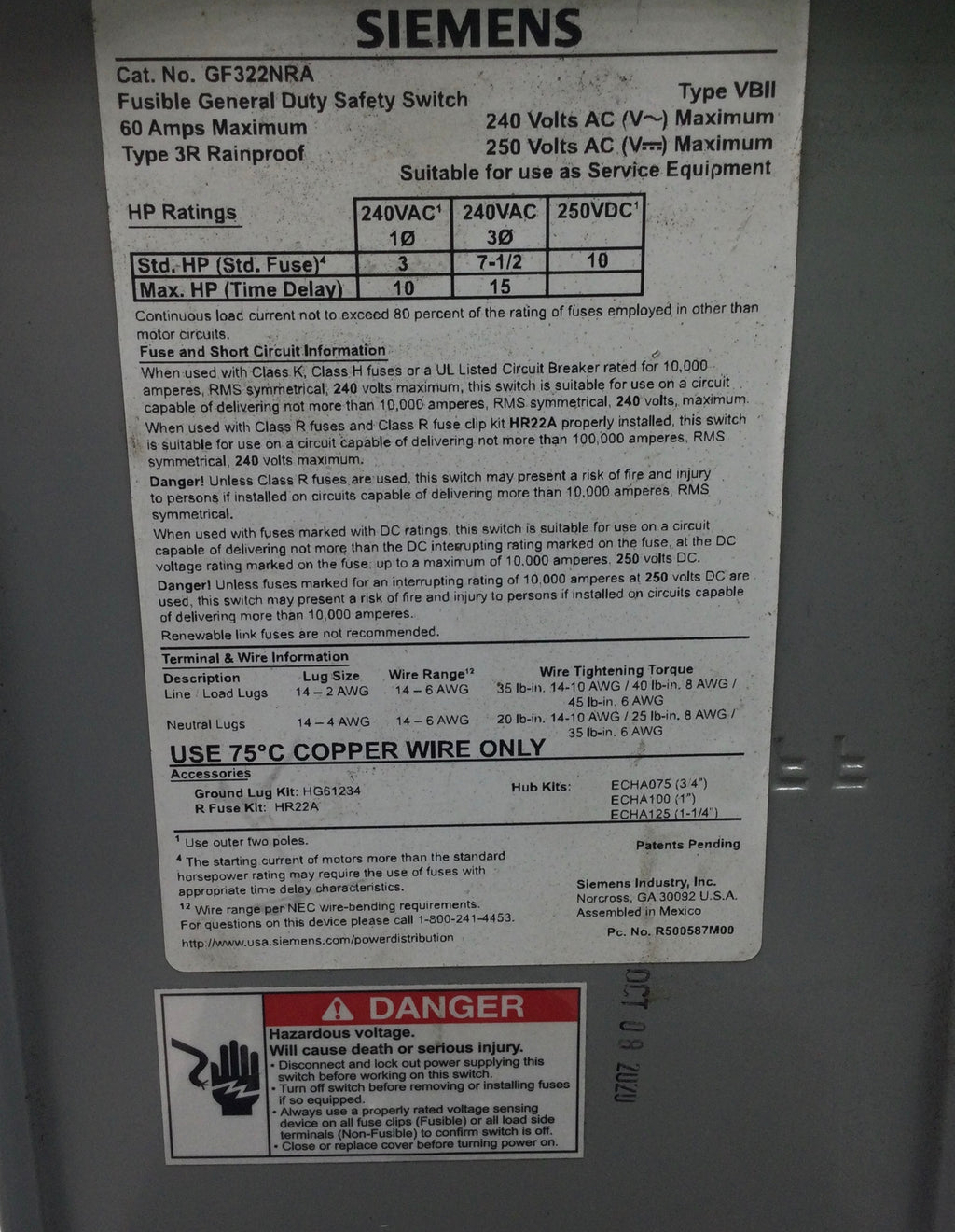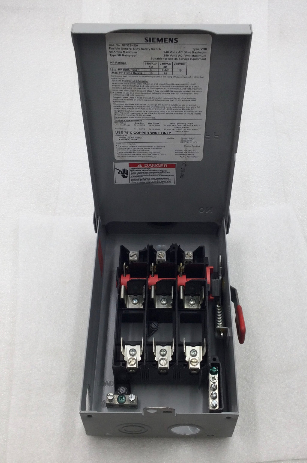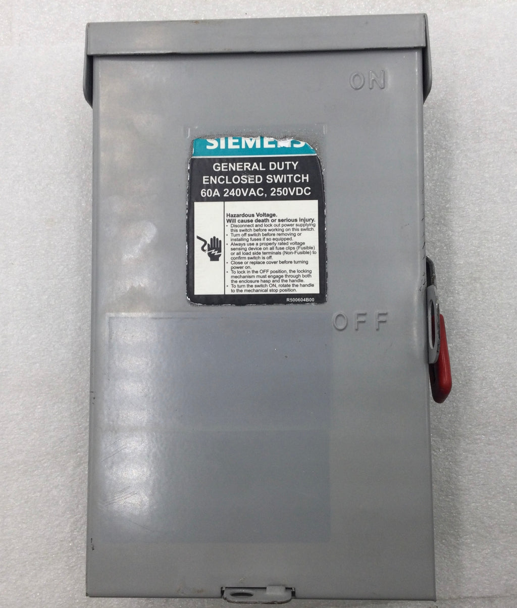 Siemens GF322NRA 60 Amp 3 Pole 240V Fusible Safety Switch - Cosmetic Flaw