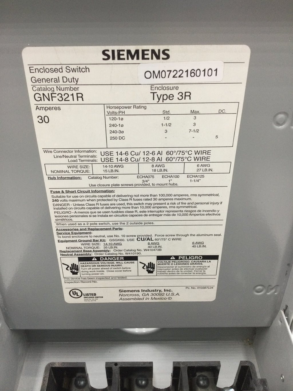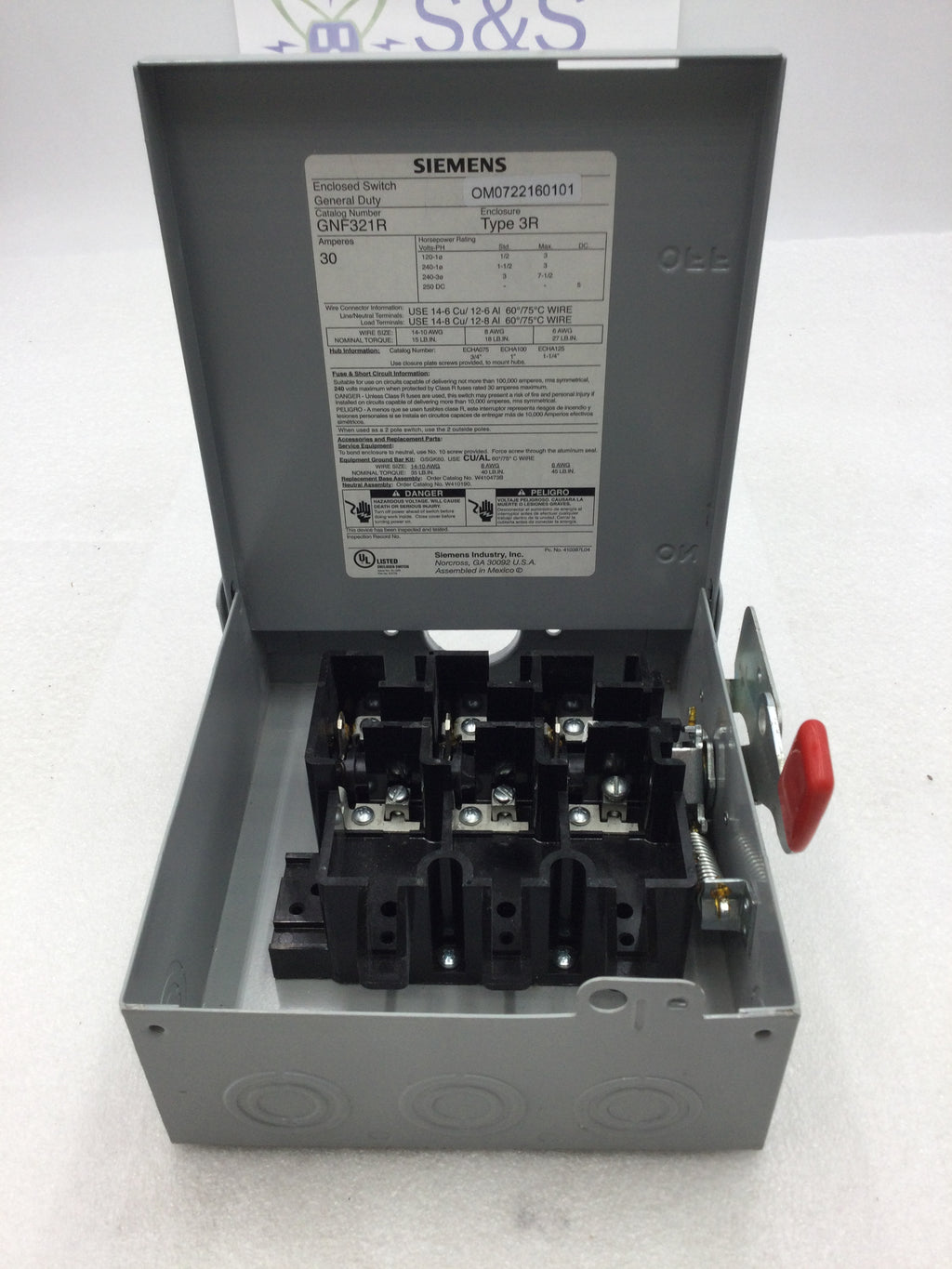 Siemens GNF321R Type 3R General Duty Non-Fused Safety Switch 30 Amp 3 Pole 240 VAC