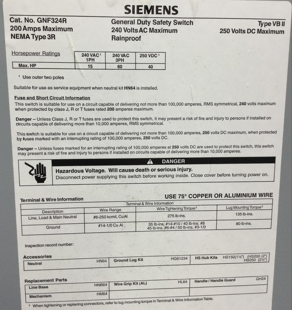 Siemens GNF324R 200 Amp 3 Pole 3 Phase 120/240V Non-Fused Safety Switch