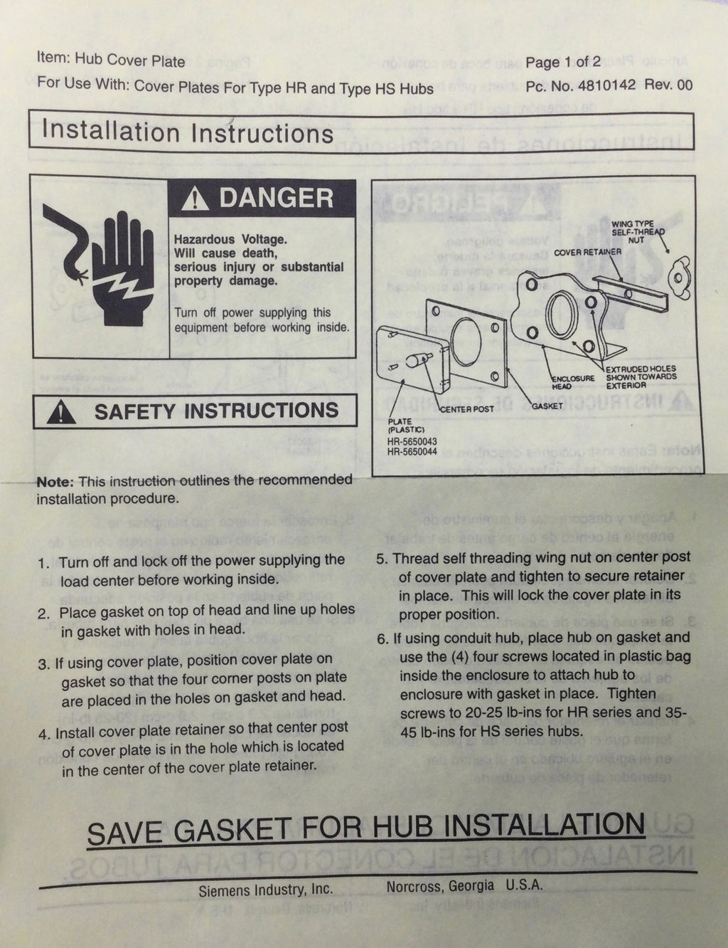 Siemens 4810142 hub cover plate for HR/HS series equipment. Revision D specification with dimensions of 3 7/8" x 3 1/2". This OEM replacement part provides proper enclosure protection and maintains equipment integrity. Genuine Siemens component engineered for reliable performance in industrial electrical applications. Direct fit for compatible HR/HS series installations.
