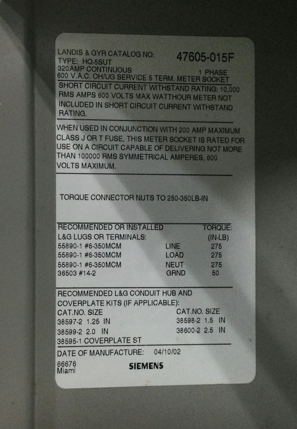 Siemens/Landis & Gyr 47605-015F 320 Amp 1 Phase 600V Meter Socket