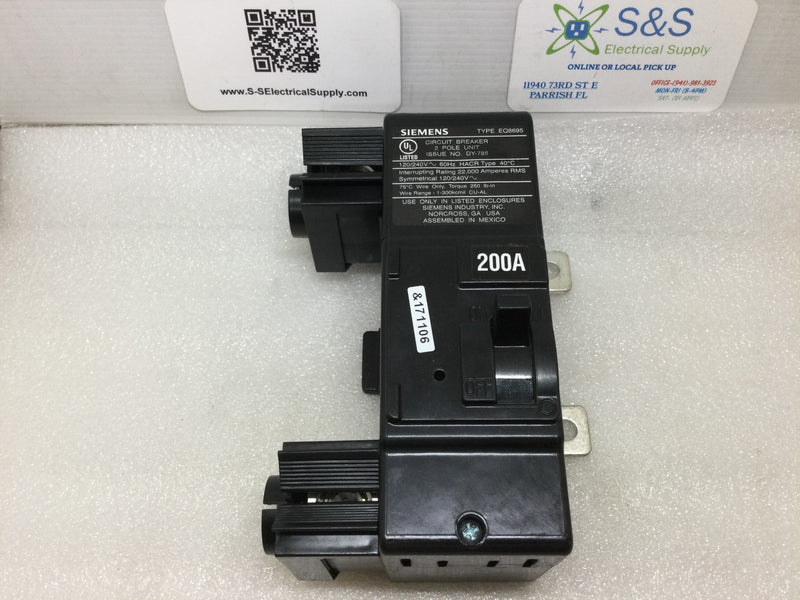 Siemens EQ8695 circuit breaker delivers reliable 200 Amp protection with 2-pole configuration for 120/240V applications. Engineered to meet stringent industry standards, this breaker provides thermal-magnetic trip protection against overloads and short circuits.