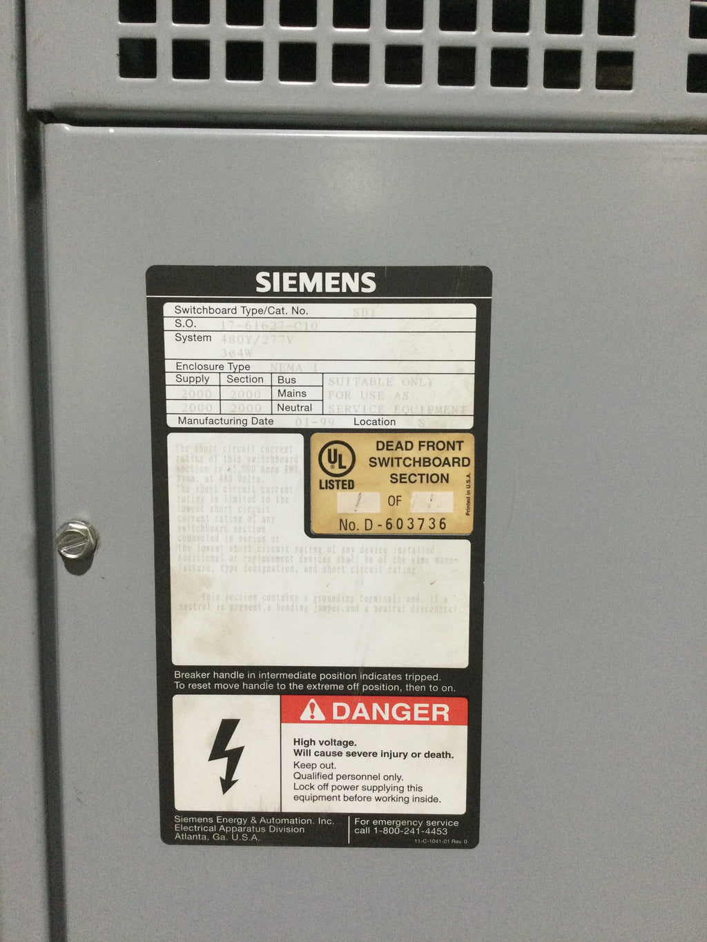 Siemens 17-61627-C10 SB1 Switchboard Nema1 Enclosure 3 Phase 480Y/277V 2000A Max
