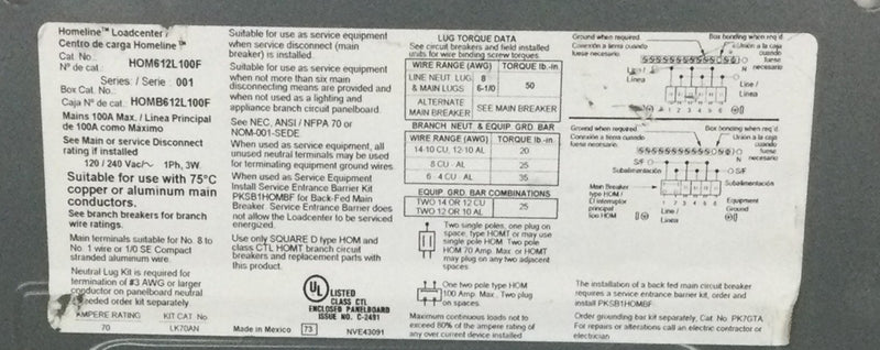 Square D HOM6-12L100F 6 space Flush Mount Panel cover 10 1/8" x 13 13/16"