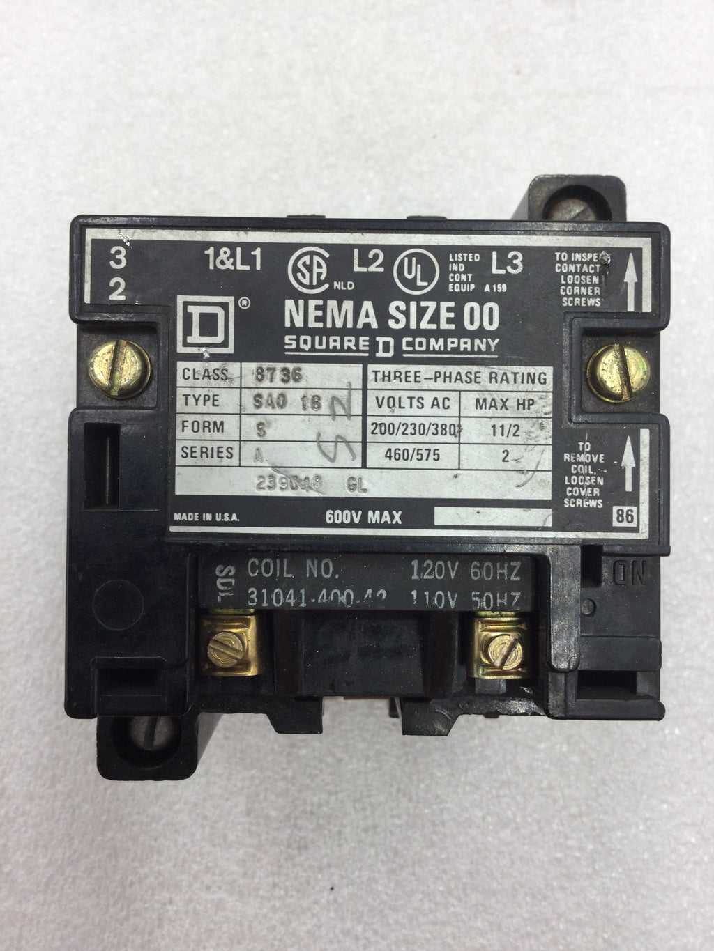 Square D 8736 SA016 Nema Size 00 Series A Starter/Contactor 3 Phase 200-575 VAC 1 1/2 to 2 HP with 120 VAC Coil