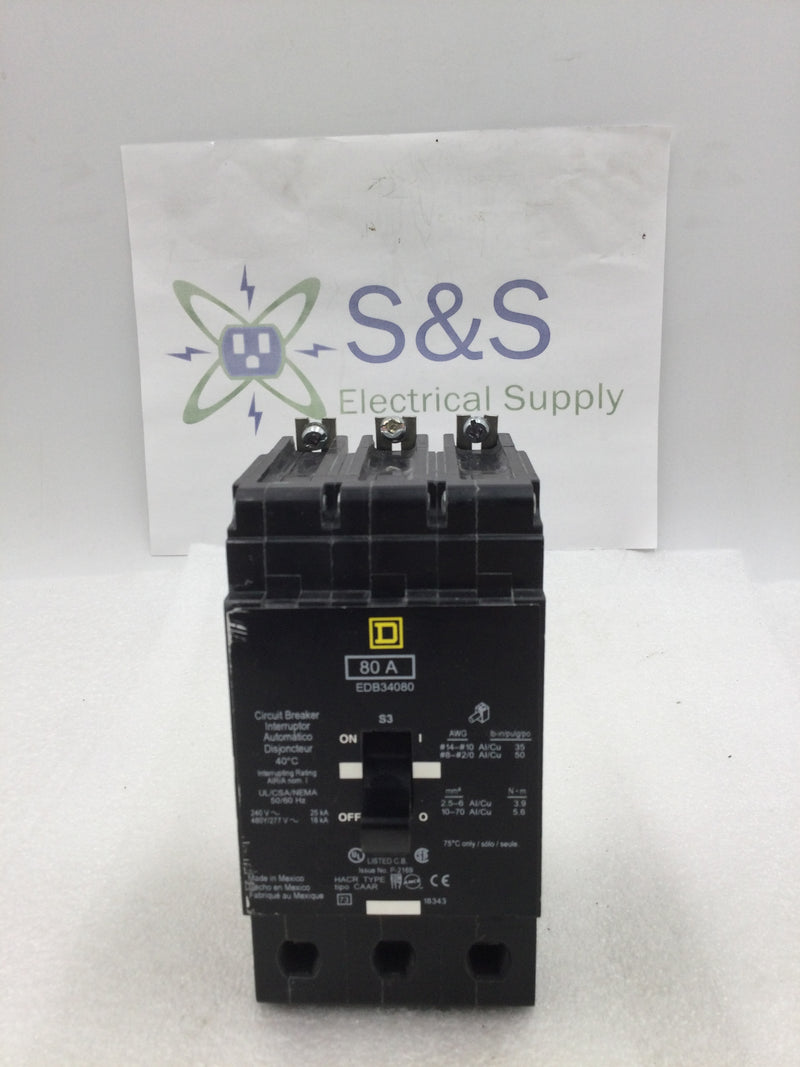 Square D EDB34080 80 Amp 3 Pole 277/480V Bolt On Type EDB Circuit Breaker