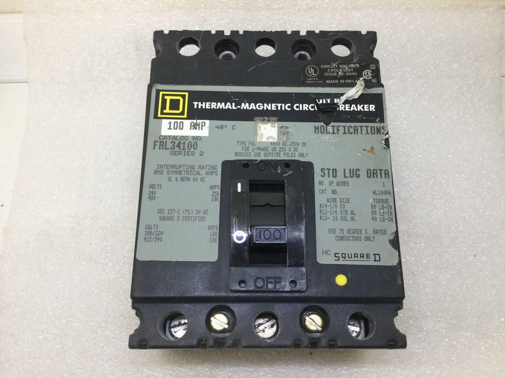 Square D FAL34100 100 Amp 3 Pole 480V Type FAL Circuit Breaker