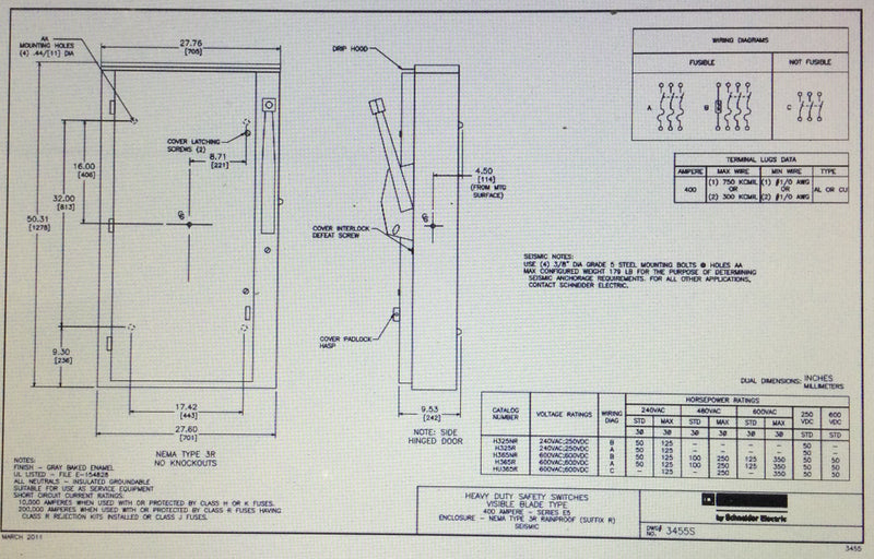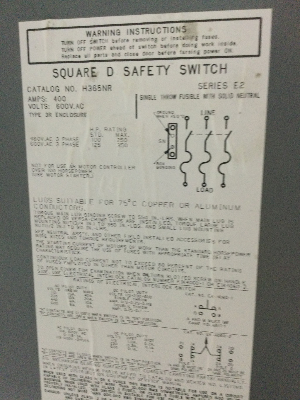 Square D H365NR -Safety switch, heavy duty, fusible, 400A, 4 wire, 3 pole, 1 neutral,  250hp, 600VAC/DC, NEMA 3R