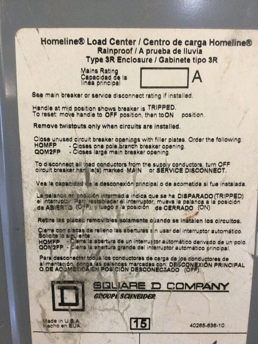 Square D HomeLine Load Center QOM2 125 Amps Type 8-Spaces 3R Enclosure Rainproof 14" X 28.25"